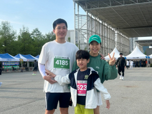 ○…사이 좋게 양손을 맞잡은 채 3대 하천 마라톤에 참여한 가족이 있다. 박원범(35)·최미화(36) 씨 부부와 아들 박지환(9) 군이 그 주인공이다. 박 씨 부부는 지난해 말부터 건강을 위해 달리기를 시작했는데, 이를 본 첫째 아들도 함께하면서 온 가족이 달리기에 열정을 갖고 있다. 첫 대회인 만큼 목표는 '완주'다. 박 씨는 하프, 최 씨와 박 군은 5㎞에 출전한다. 긴장은 되지만, 주중에 매일 3-5㎞씩 연습해 거뜬할 것이라는 게 이들의 설명이다. 박 씨 부부는 "둘째도 있는데 아직 초등학교도 들어가지 않은 어린이라 대회에는