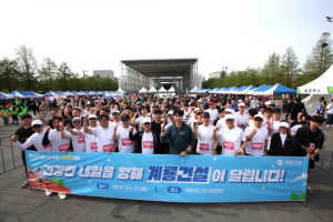 충청을 대표하는 건설사인 계룡건설이 27일 열린 제21회 3대하천 마라톤대회에서 직원 간 화합과 결속을 다졌다.계룡건설은 이승찬 회장, 윤길호 사장, 권용봉·조명원 부사장, 박희성 KR산업 대표와 각 본부별 직원 등 120여 명이 참석, '건강한 내일을 향해 계룡건설이 달립니다'를 실천했다.이날 대회엔 계룡건설이 지난해 창단한 실업팀 '철인3종 선수단' 소속 남자선수 3명이 번외로 참가, 동호인들과 10㎞를 함께 뛰었다. 대전시체육회장을 맡고 있는 이승찬 회장도 이날 10㎞를 완주, 직원 및 동호인들과 함께 호흡했다.특히 첫 출전한