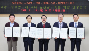 대전시가 국방·우도반도체 공급망의 거점지로 발돋움한다.시는 18일 시청에서 KAIST, 한국전자통신연구원(ETRI), 한화시스템, 대전테크노파크와 '국방·우주반도체 국내 공급망 구축을 위한 업무협약'을 체결했다.협약은 국가 안보에 필수적인 국방·우주반도체 개발 및 제조 생태계 구축을 목표로 한다.이를 통해 기관들은 반도체 국산화 및 성능 고도화를 위한 공동 연구개발, 공정개발 및 제조를 위한 공공팹(fab) 구축, 전문인력 양성 등에 협력키로 했다.대전은 첨단 연구기관, 국방산업 기반, 반도체 전문인재 양성체계를 갖춘 최적지로 평가