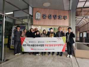 대전 서구가 19일 대전도시공사, 대전서구지역자활센터와 청년 자활근로사업장 조성을 위한 무상 임대 업무협약을 했다.협약에 따라 대전도시공사는 2년 동안 상가를 무상 임대하고, 대전서구지역자활센터는 공실 상가 내부를 리모델링해 실제 일자리 공간으로 운영할 예정이다.구는 저소득층 자립 지원 및 자활근로사업단 운영을 위한 행·재정적 지원을 할 계획이다.구는 지난해 10월 보라아파트 단지 내 빈 상가에 첫 번째 청년 자활근로사업장인 '꿈심당 호두'를 운영한 데 이어 사업장을 확대하는 게 목표다.서철모 구청장은 "어려운 형편에 있는 청년들이