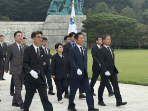 27일 오전 정청래 더불어민주당 대표를 비롯한 당 지도부가 국립대전현충원에서 참배하고 있다. 민주당은 이날 대전에서 현장 최고위원회를 개최한다. 최다인 기자