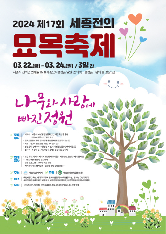 세종시가 주최하고 전의묘목협동조합이 주관하는 제17회 세종전의묘목축제가 22-24일 전의면 세종묘목플랫폼 일원에서 열린다. 꽃나무와 과실수, 조경수 묘목을 전시 판매하고, 무료 묘목나눔 행사도 갖는다.