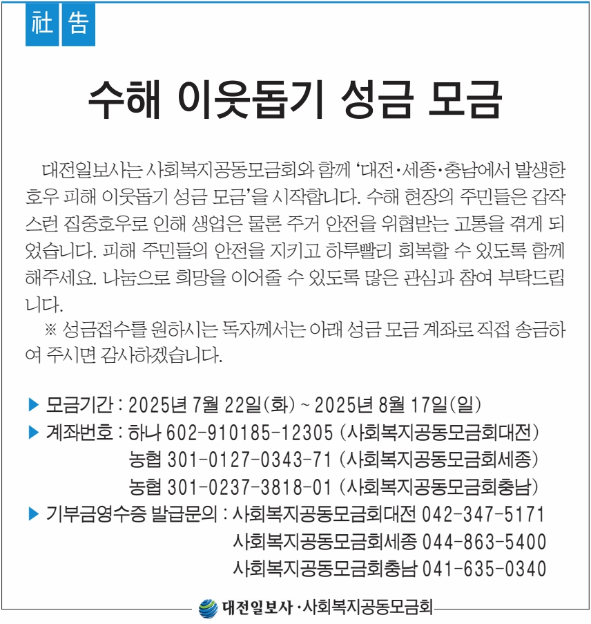 대전일보사는 사회복지공동모금회와 함께 '대전·세종·충남에서 발생한 호우 피해 이웃돕기 성금 모금'을 시작합니다. 수해 현장의 주민들은 갑작스런 집중호우로 인해 생업은 물론 주거 안전을 위협받는 고통을 겪게 되었습니다. 피해 주민들의 안전을 지키고 하루빨리 회복할 수 있도록 함께 해주세요. 나눔으로 희망을 이어줄 수 있도록 많은 관심과 참여 부탁드립니다.