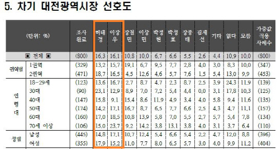 이어 민주당 장철민 의원 10.8%, 국힘 이상민 대전시당위원장 10.0%, 민주당 박정현 의원 6.7%, 국힘 박성효 전 대전시장 6.6%, 민주당 장종태 의원 5.5%, 민주당 김제선 중구청장 2.6% 순입니다.
