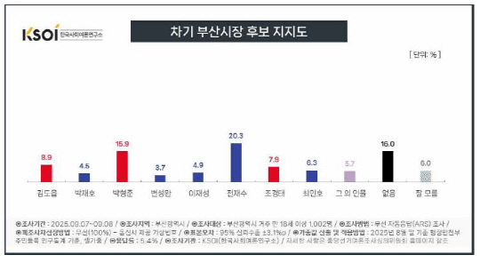 ②부산일보가 한국사회여론연구소(KSOI)에 의뢰해 지난 7-8일 부산시 유권자 1002명(무선 ARS)을 대상으로 부산시장 후보 여야 지지도 조사 결과, 민주당 전재수 해양수산부 장관 20.3%, 국민의힘 박형준 부산시장 15.9%로 나타났습니다.