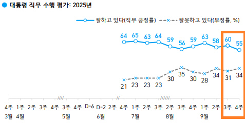 한국갤럽이 지난 23-25일 전국 만 18세 이상 유권자 1002명(무선 전화면접)을 대상으로 '이재명 대통령의 직무 수행'에 대해 물은 결과 긍정평가 55%, 부정평가 34%, '의견유보' 11%로 나타났습니다. 긍정평가는 전 주에 비해 5%p 하락했고, 부정평가는 3%p 상승했습니다. 이 대통령 지지율은 취임 후 최저치입니다.