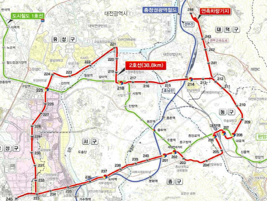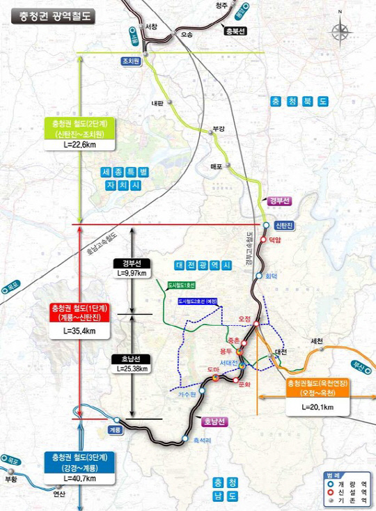 충청권 메가시티 조성을 위한 대전 중심의 광역철도 사업도 병행되고 있다. 계룡~신탄진 35.4㎞ 구간의 도심 국철을 활용, 도시철도 1·2호선과 연계한 광역철도망을 구축할 계획이다. 이는 충청권 주요 도시의 활력 제고와 지역균형발전 도모, 대전 도심 내 도시철도 기능 강화를 함께 노린다.