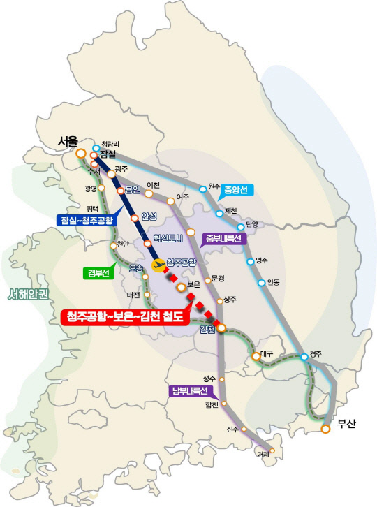 ◇'청주공항-보은-김천 내륙철도'…하늘길·육로의 연결=청주공항-보은-김천 내륙철도는 수도권과 중부, 남부를 최단 거리로 직결하는 사업이다. 총연장 96.1㎞, 총사업비 3조 248억 원 규모로, 청주공항에서 보은을 거쳐 김천을 잇는다. 현재 추진되고 있는 잠실-청주공항 광역철도와 남부 내륙선(김천-거제)과 직결돼 서울 강남에서 시작해 수도권과 남해안을 최단 거리로 연결하는 국가의 새로운 종단철도망이 완성된다.