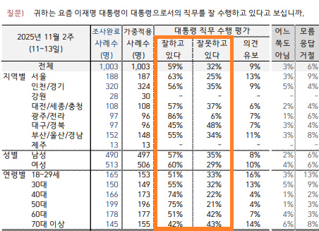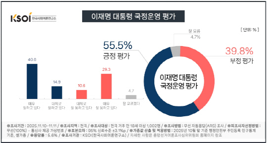 ③한국사회여론연구소(KSOI)가 지난 10-11일 전국 유권자 1002명(무선 ARS)을 대상으로 조사한 결과 긍정평가 55.5%, 부정평가 39.8%, '잘 모름' 4.7%로 집계됐습니다. 긍정평가는 2주 전 보다 4.0%p 오른 반면 부정평가는 3.8%p 내렸습니다. KSOI는 "긍정평가는 APEC 정상회의의 성공적 개최, 한미 관세협정 타결, KOSPI 지수 4000선 돌파 등 외교적 성과와 경제회복에 대한 기대감이 반영된 결과로 보인다"고 밝혔습니다.