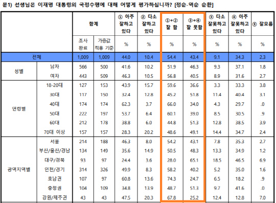 ④쿠키뉴스가 한길리서치에 의뢰해 지난 8-10일까지 전국 유권자 1009명(유선 전화면접 3.5%·무선 ARS 96.5%)을 대상으로 물었더니 긍정평가 54.4%, 부정평가 43.4%로 나왔습니다. 긍정평가는 9월 50.1% 이후 10월 51.7%로 소폭 반등했으며 이달도 2.7%p 오르며 상승 기조를 이어갔습니다.