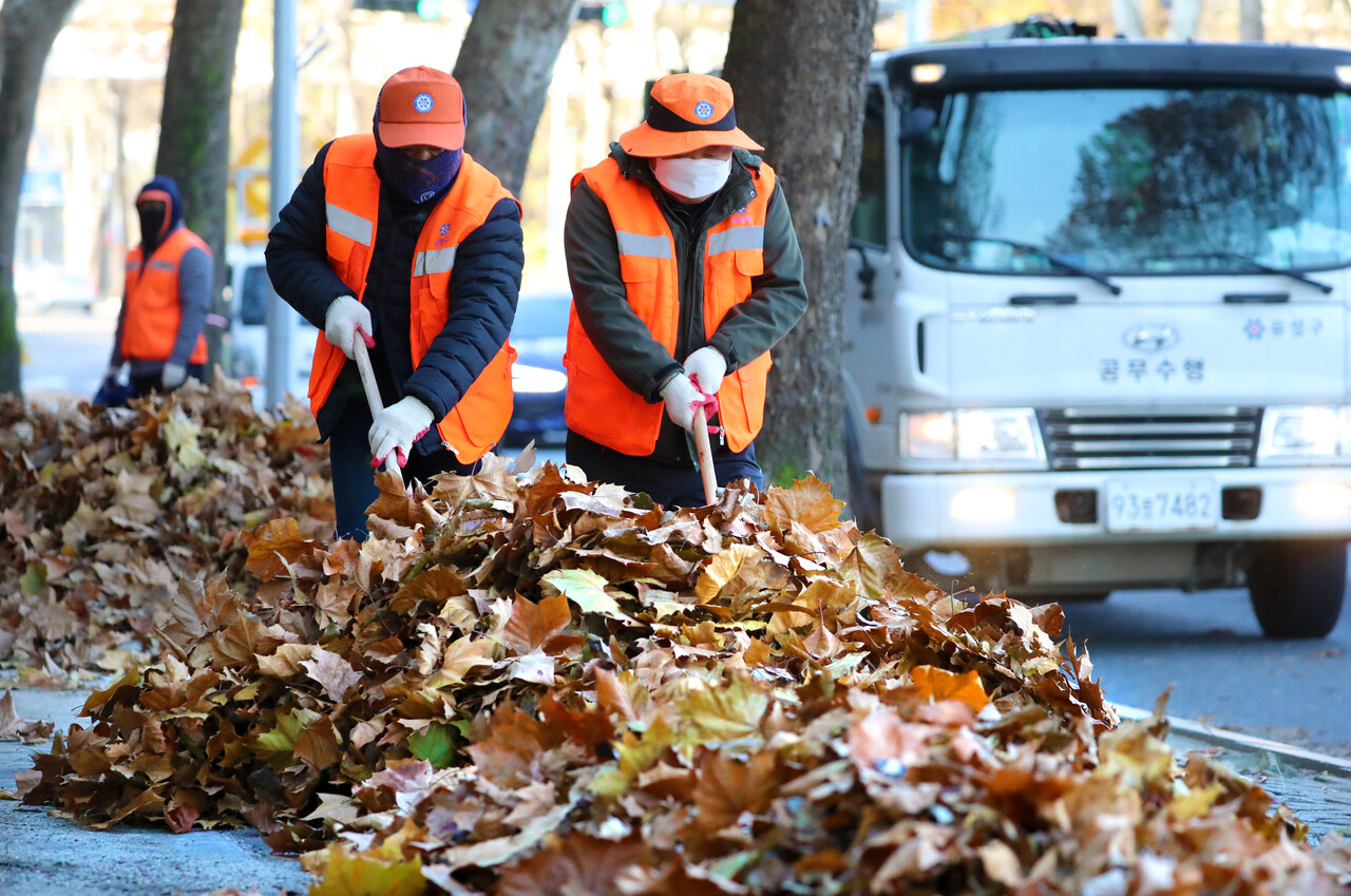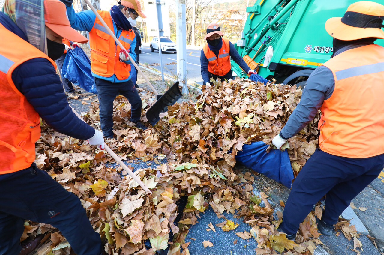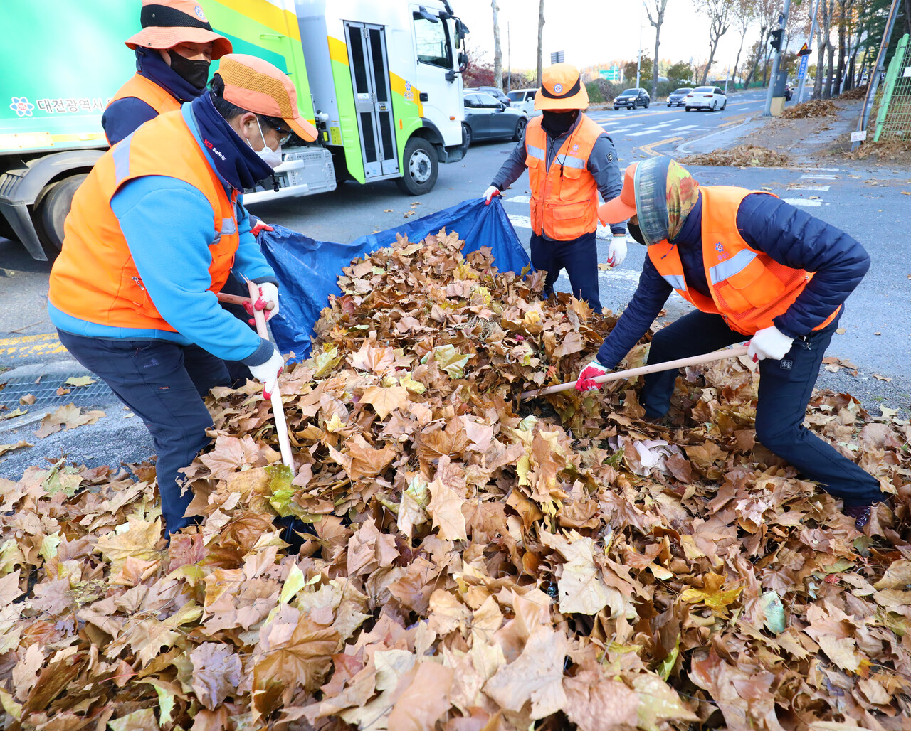 19일 오전 대전 유성구 화암네거리 인근에서 유성구청 청소행정과 기동반 직원들이 전동 송풍기를 이용해 인도에 쌓인 낙엽을 정리하고 있다. 겨울철 절기 ‘소설’을 앞두고 유성구는 낙엽으로 인한 배수로 막힘을 예방하기 위한 집중 정비를 실시했다.