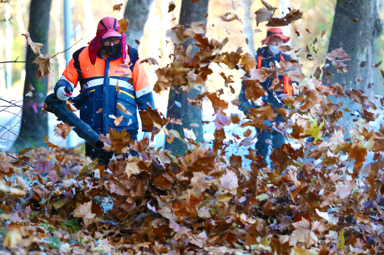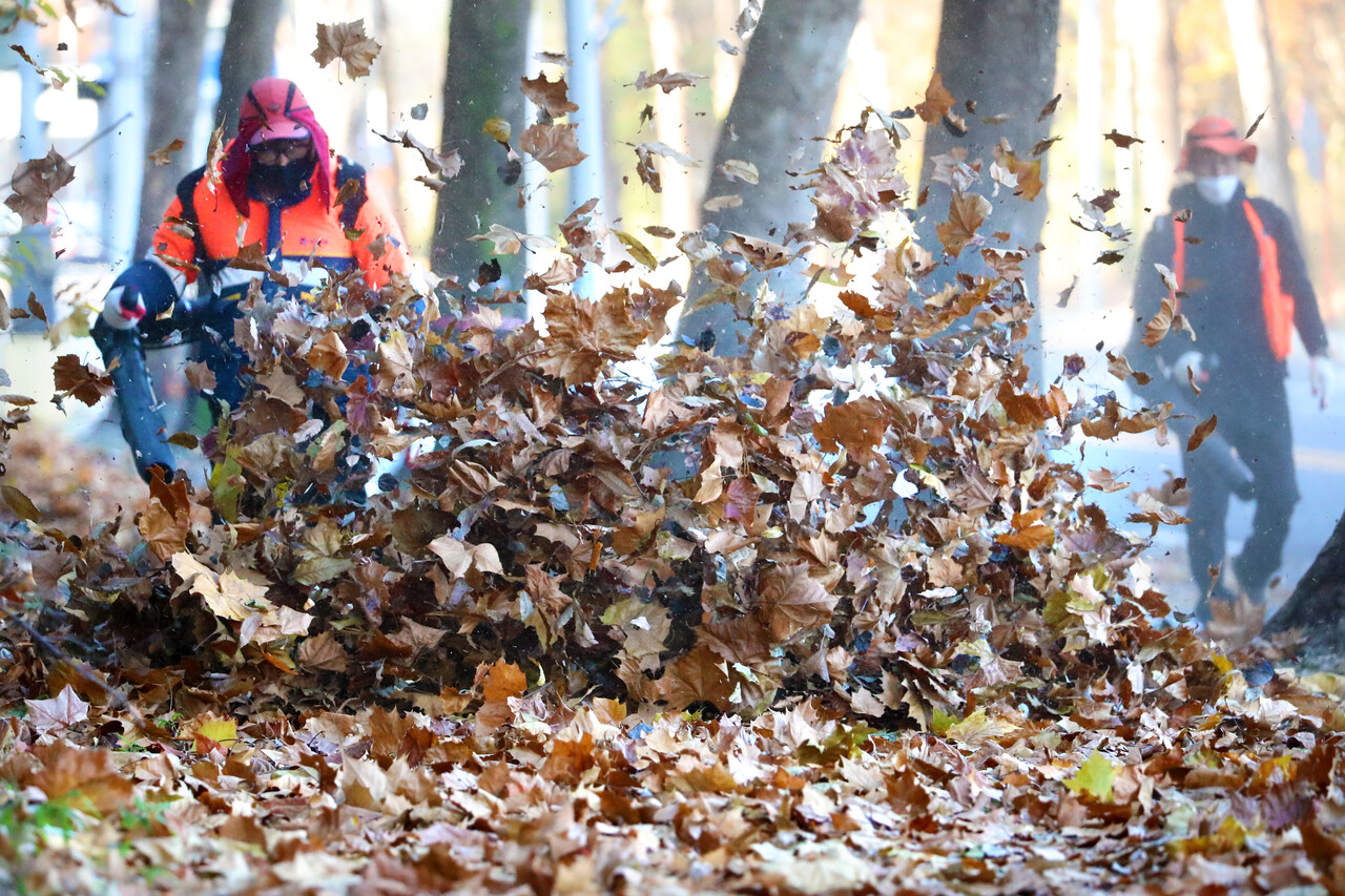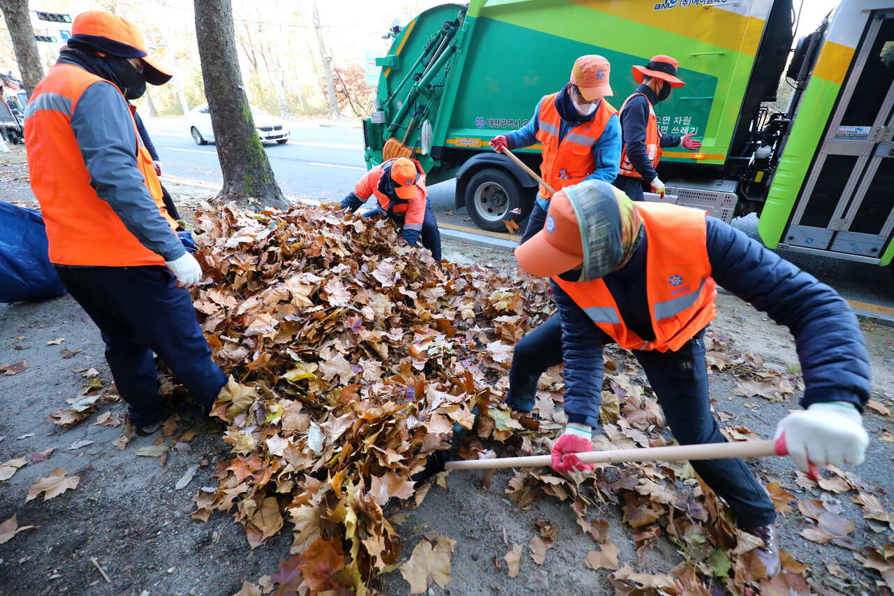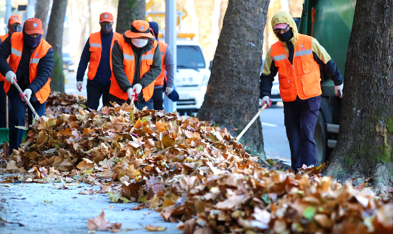 19일 오전 대전 유성구 화암네거리 인근에서 유성구청 청소행정과 기동반 직원들이 전동 송풍기를 이용해 인도에 쌓인 낙엽을 정리하고 있다. 겨울철 절기 ‘소설’을 앞두고 유성구는 낙엽으로 인한 배수로 막힘을 예방하기 위한 집중 정비를 실시했다.