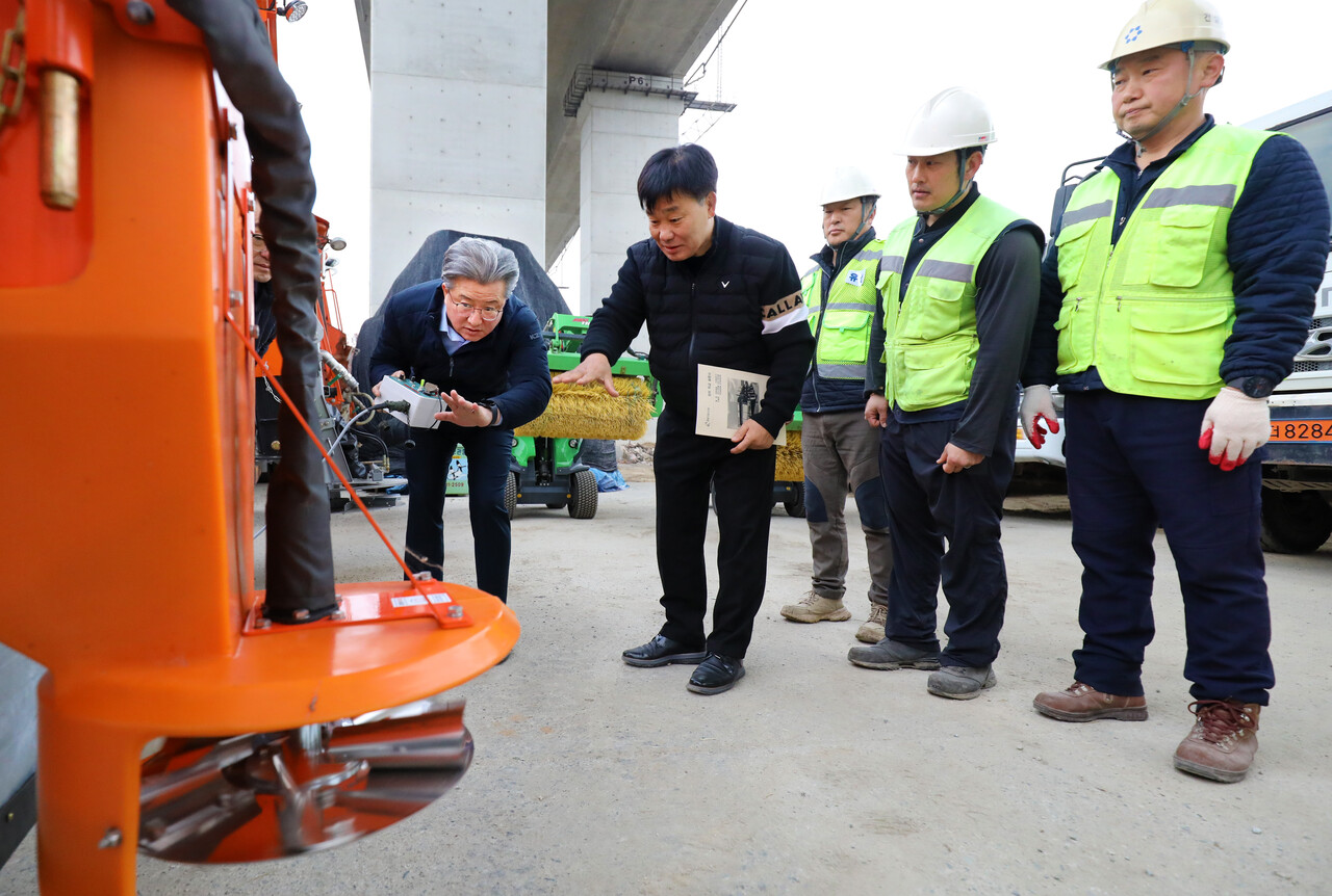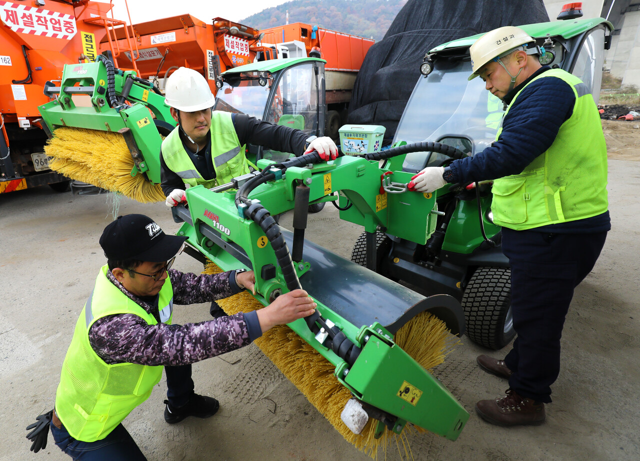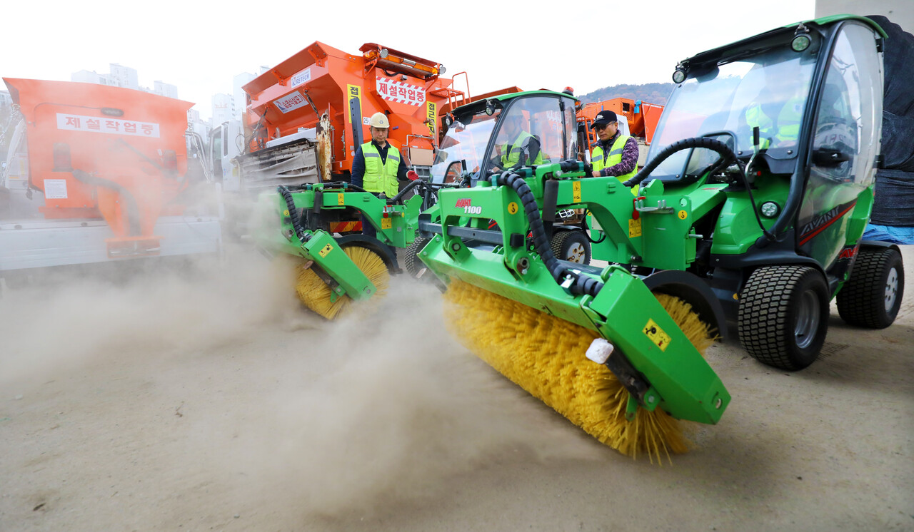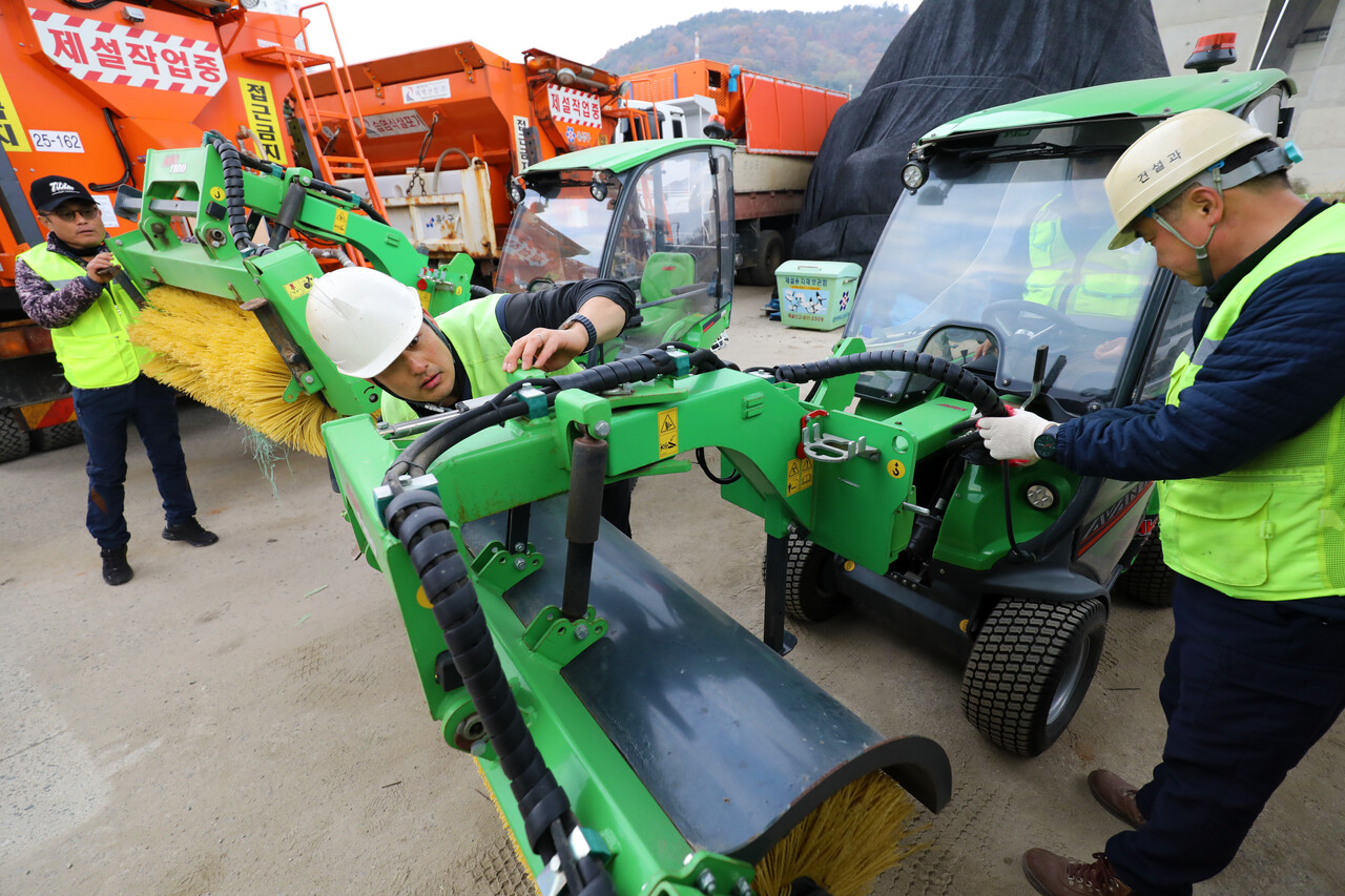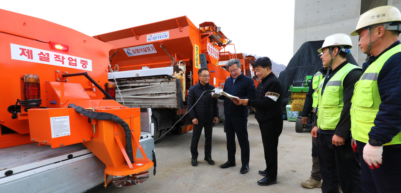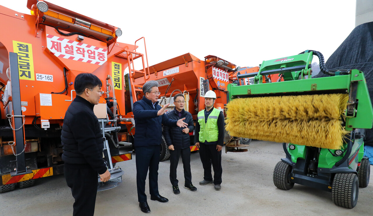 첫눈이 내린다는 절기상 ‘소설’을 이틀 앞둔 20일 오전 대전 유성구 외삼동 제설자재보관소에서 정용래 유성구청장이 건설과 도로관리팀 직원들과 함께 겨울철 폭설에 대비해 제설차 작동 여부와 안전장비를 점검하고 있다.