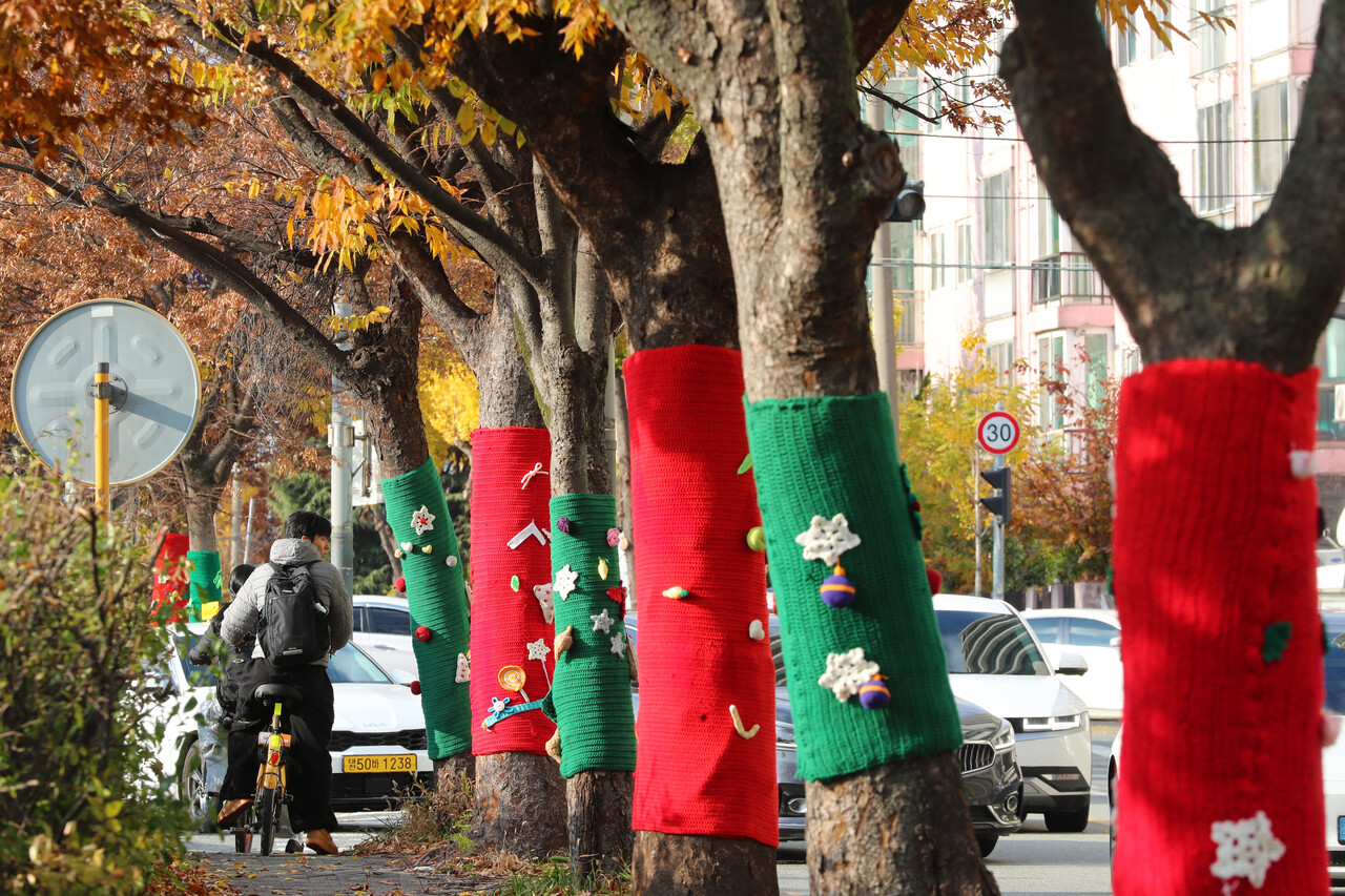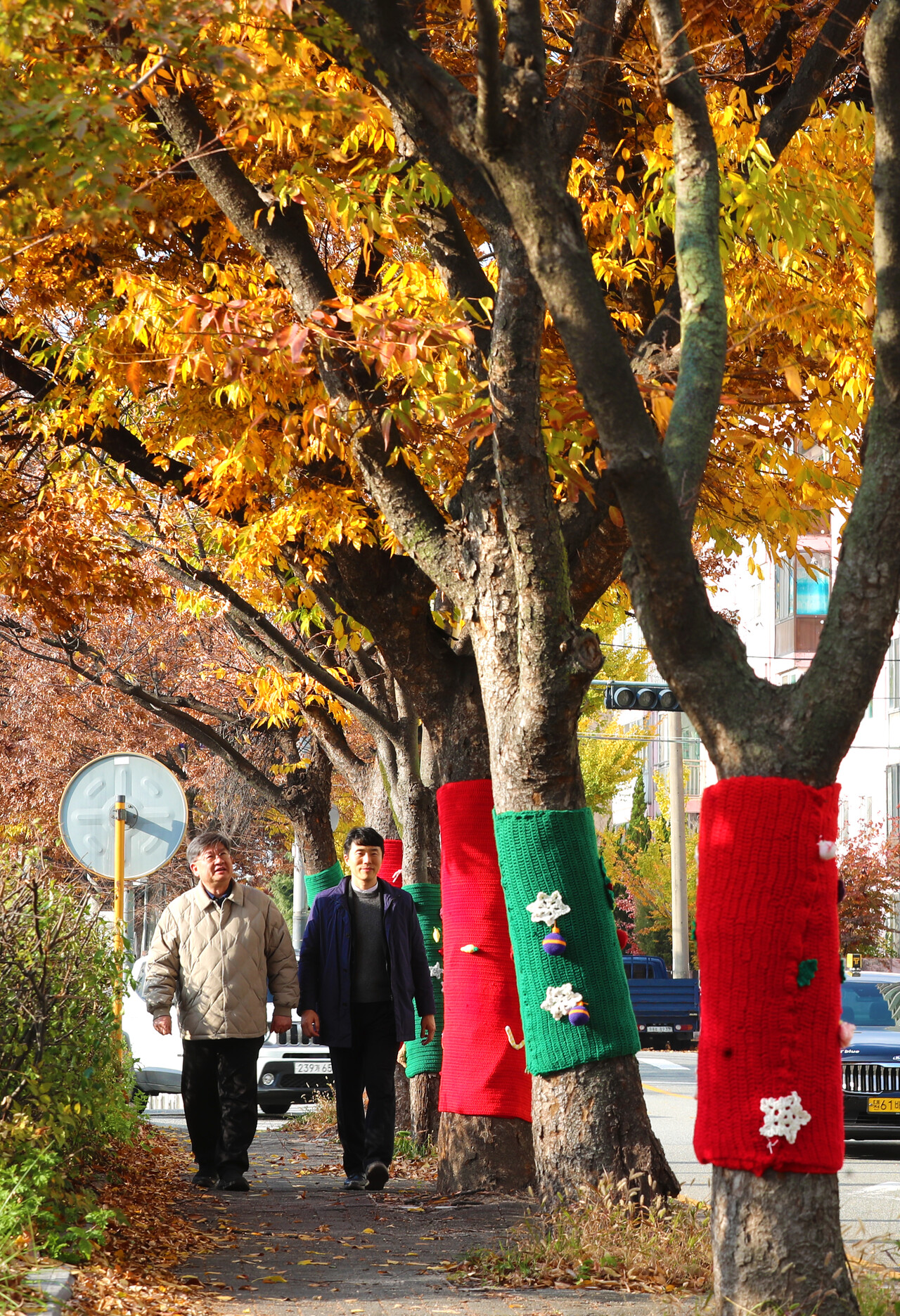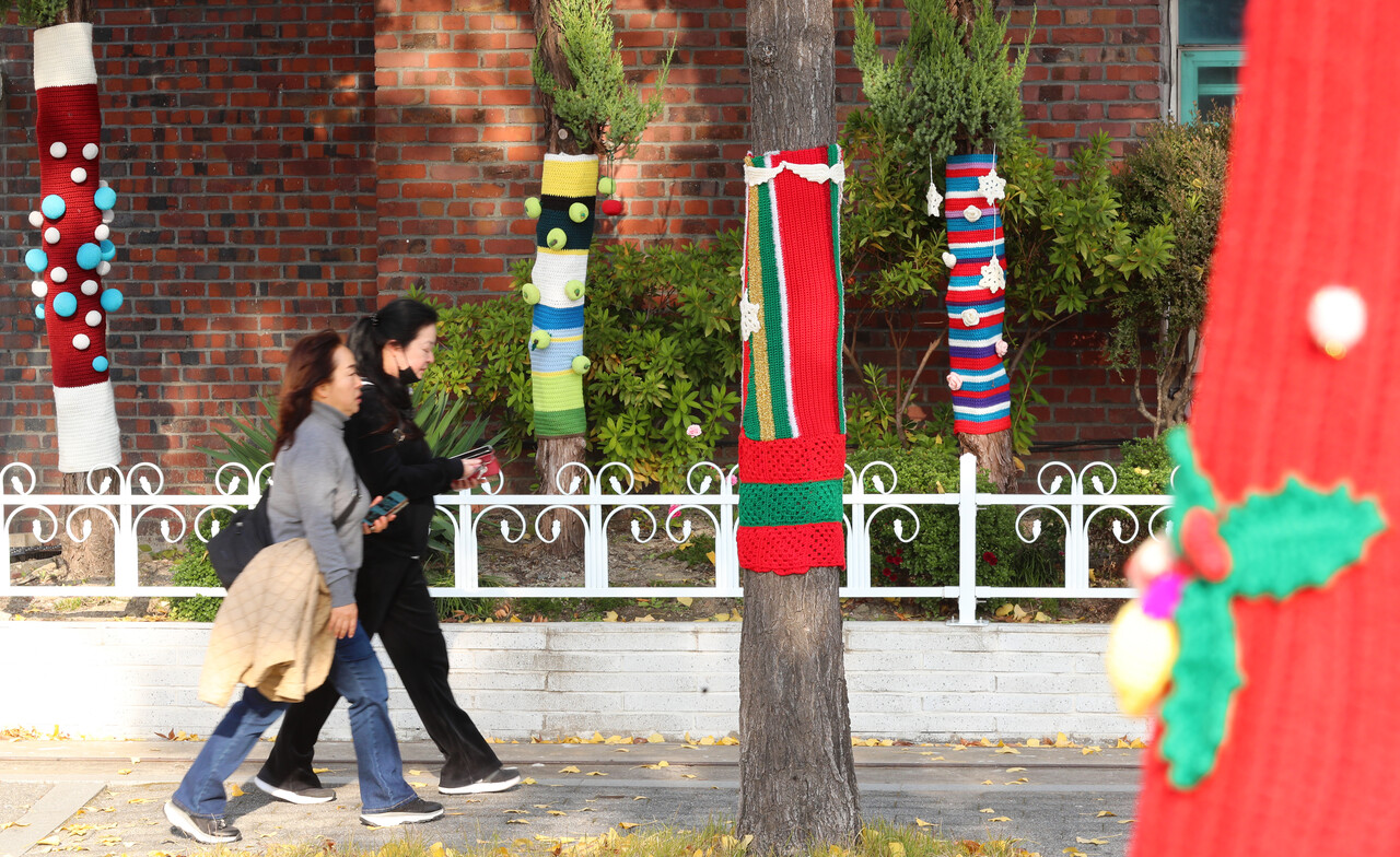 소설을 앞둔 20일 오후 차가운 바람 속에서도 대전 동구 중동 주향교회 앞 가로수들은 알록달록 뜨개옷을 두르고 따뜻함을 전했다. 그 사이로 두꺼운 옷을 챙겨 입은 시민들이 자전거를 타고 조용히 길을 지나가며 겨울이 성큼 다가옴을 느끼게 한다.