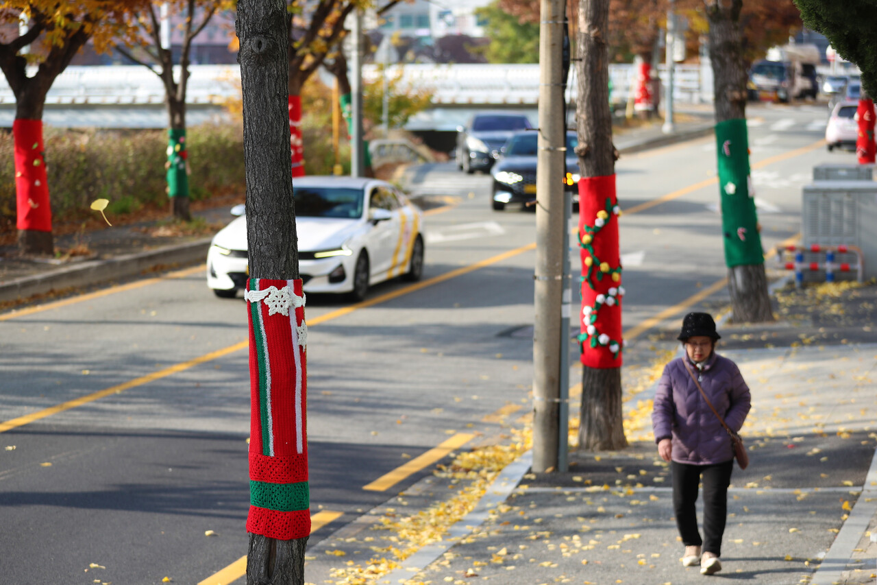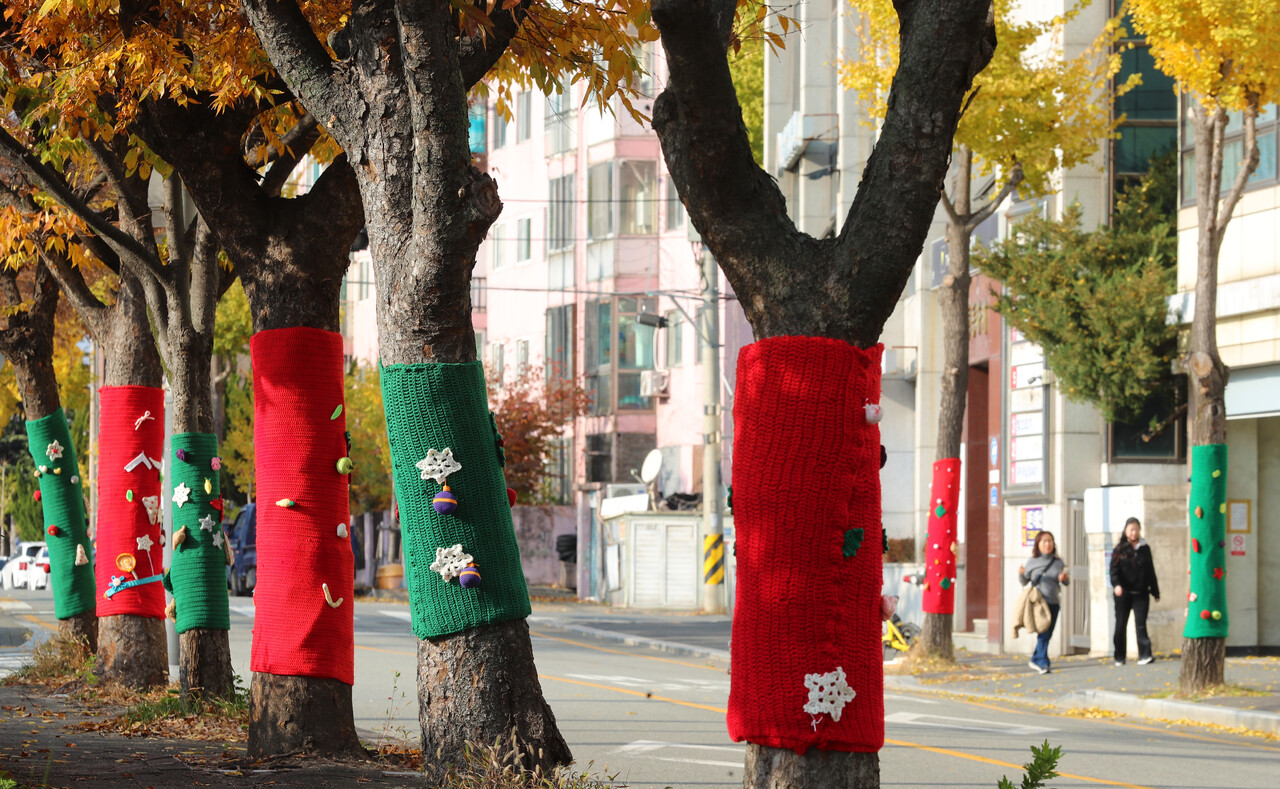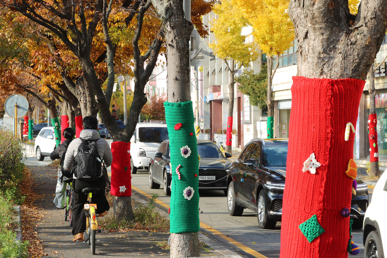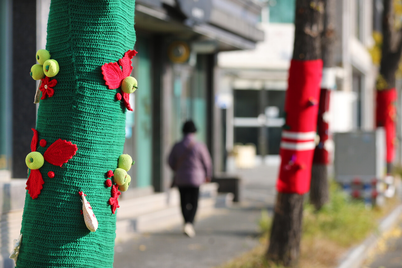 소설을 앞둔 20일 오후 차가운 바람 속에서도 대전 동구 중동 주향교회 앞 가로수들은 알록달록 뜨개옷을 두르고 따뜻함을 전했다. 그 사이로 두꺼운 옷을 챙겨 입은 시민들이 자전거를 타고 조용히 길을 지나가며 겨울이 성큼 다가옴을 느끼게 한다.